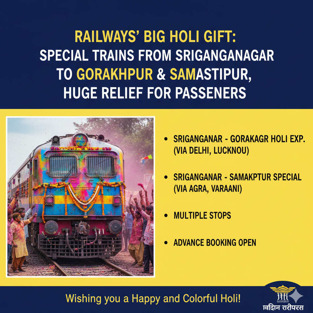 होली पर रेलवे का बड़ा तोहफा: श्रीगंगानगर से गोरखपुर और समस्तीपुर के लिए चलेंगी स्पेशल ट्रेनें, यात्रियों को मिलेगी भारी राहत