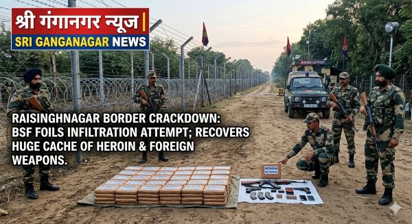रायसिंहनगर बॉर्डर पर बड़ी कार्रवाई: BSF ने विफल की घुसपैठ, भारी मात्रा में हेरोइन और विदेशी हथियार बरामद