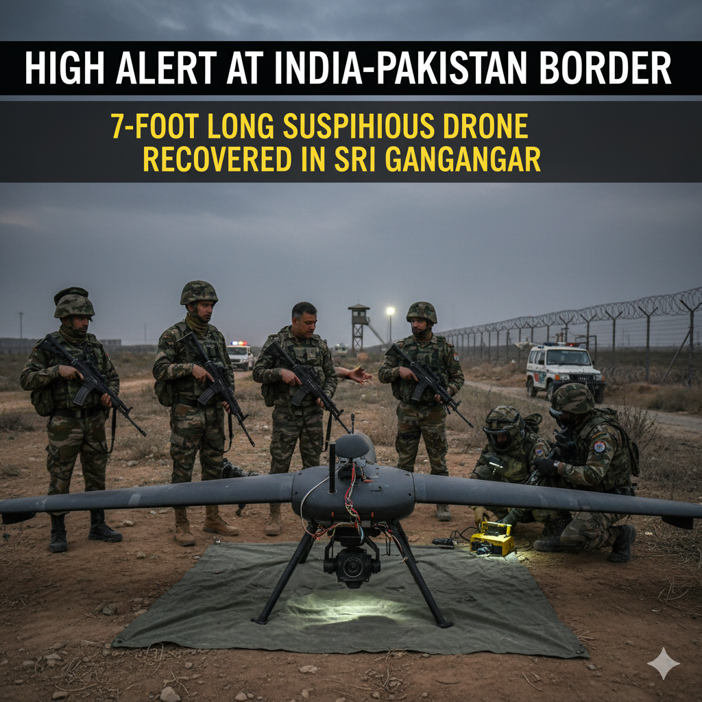 भारत-पाक सीमा पर हाई अलर्ट: श्रीगंगानगर में 7 फीट लंबा संदिग्ध ड्रोन बरामद