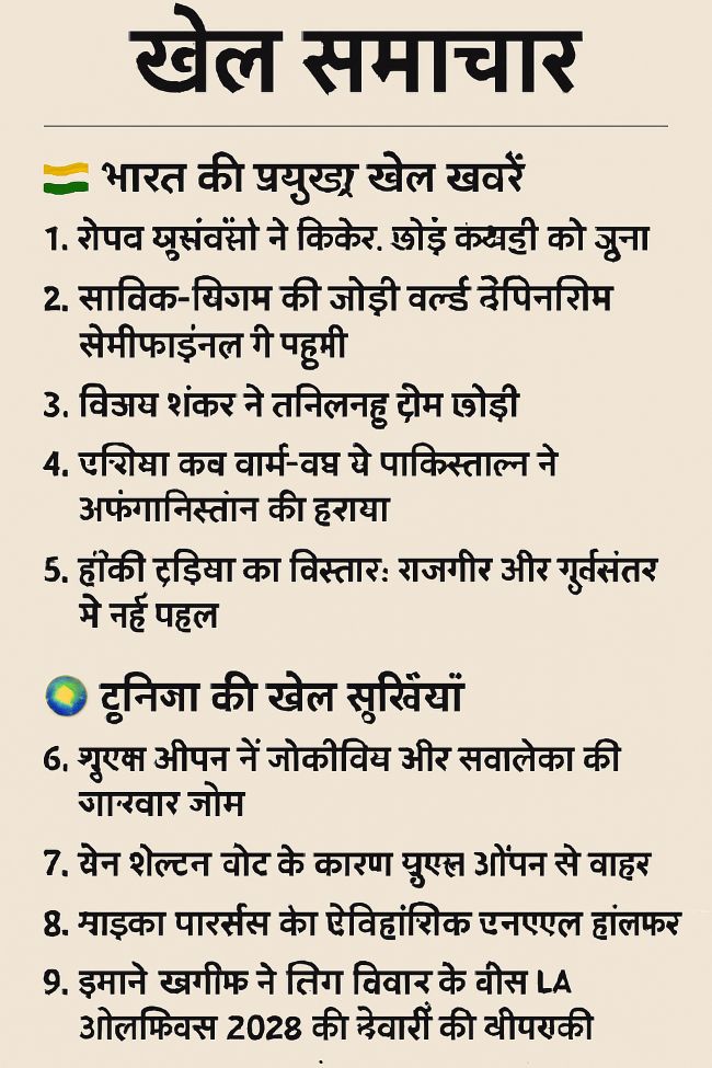 बिलकुल Ronak! यहाँ पर 10 ताज़ा और दिलचस्प खेल समाचारों के सारांश दिए गए हैं, जो विभिन्न खेलों से जुड...