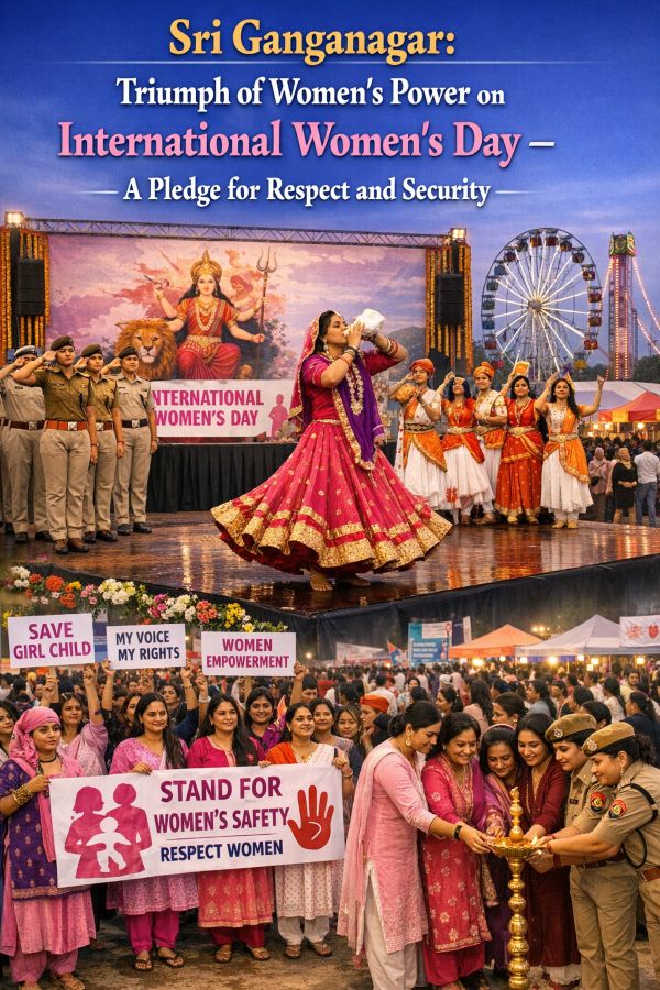 श्रीगंगानगर। आज 8 मार्च 2026 को समूचे विश्व के साथ-साथ श्रीगंगानगर जिले में भी अंतर्राष्ट्रीय महिला दिवस ‘नारी शक्ति’ के उत्सव के रूप में मनाया गया। “एक समावेशी दुनिया का निर्माण” के वैश्विक संदेश के साथ, जिला प्रशासन, पुलिस विभाग और विभिन्न सामाजिक संस्थाओं ने मिलकर महिलाओं के सम्मान, उनकी उपलब्धियों और सबसे महत्वपूर्ण, उनकी सुरक्षा को समर्पित कई प्रभावशाली कार्यक्रम आयोजित किए।