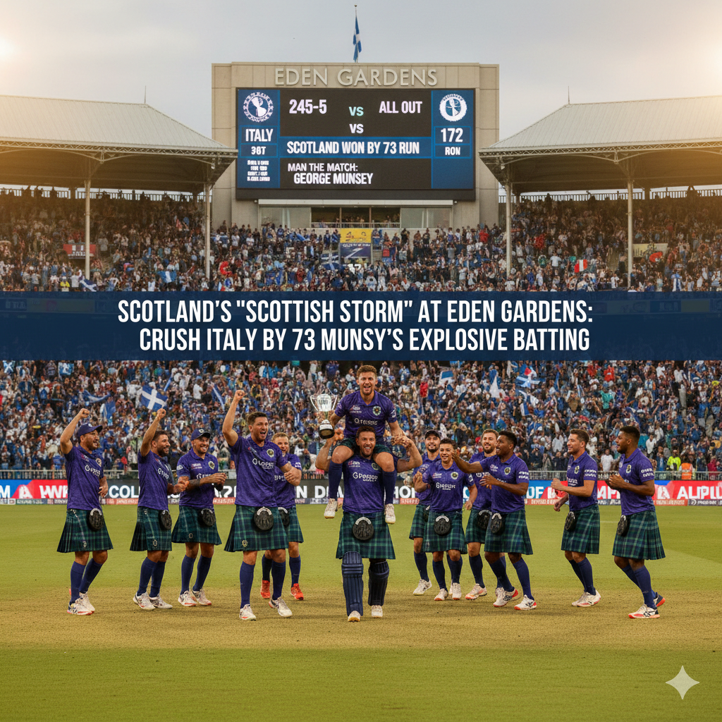 कोलकाता। ऐतिहासिक ईडन गार्डन्स के मैदान पर आज ICC पुरुष टी-20 वर्ल्ड कप 2026 का एक बेहद रोमांचक मुकाबला खेला गया। ग्रुप स्टेज के इस मैच में स्कॉटलैंड ने अपने बेहतरीन ऑलराउंड प्रदर्शन के दम पर इटली को 73 रनों के विशाल अंतर से शिकस्त दी। इस जीत के साथ स्कॉटलैंड ने टूर्नामेंट के अगले दौर की अपनी राह आसान कर ली है, वहीं इटली के लिए यह हार दोहरी मुसीबत लेकर आई है।